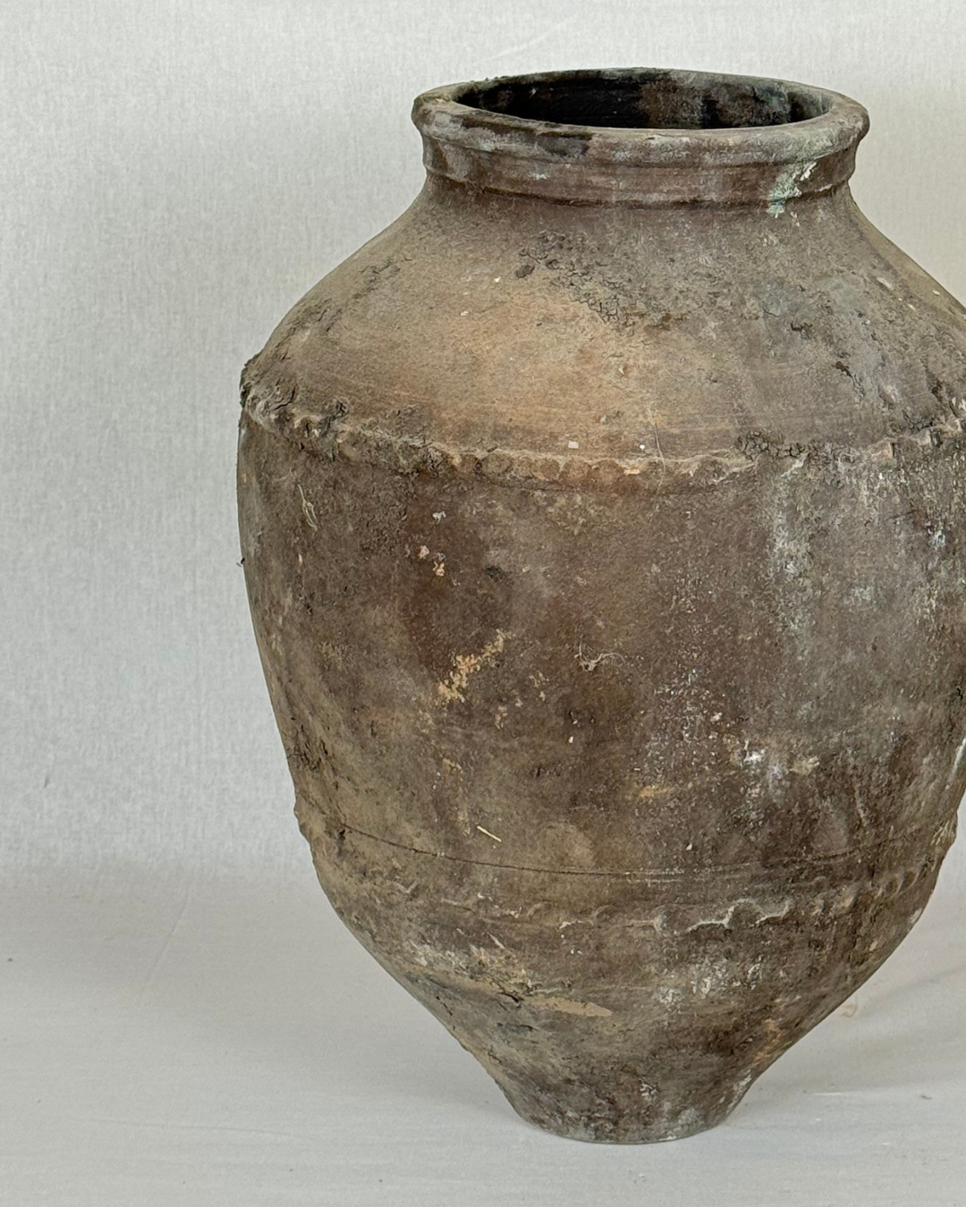 This rustic pot from Anatolia, Turkey, exudes history and charm. Originally used to store olive oil, honey, water, or wine, it is made from terracotta clay and has developed a rich, aged patina over time. Some pieces can have subtle oil stains, adding to their unique character. Hand-thrown and one-of-a-kind, each pot makes a striking decorative statement for the home or garden.