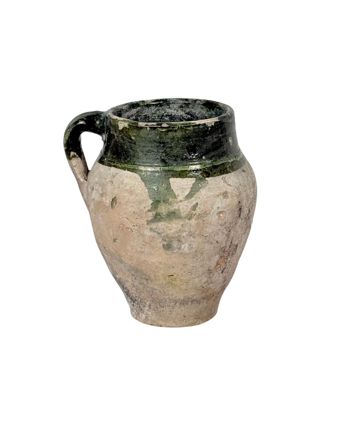 Each vase is unique, featuring one or two handles, variations in green glaze, shape, and patina. Signs of previous use, such as markings or remnants, add to its authentic character. This piece is not water-tight and should be paired with an inner vessel or vials if used for fresh stems.