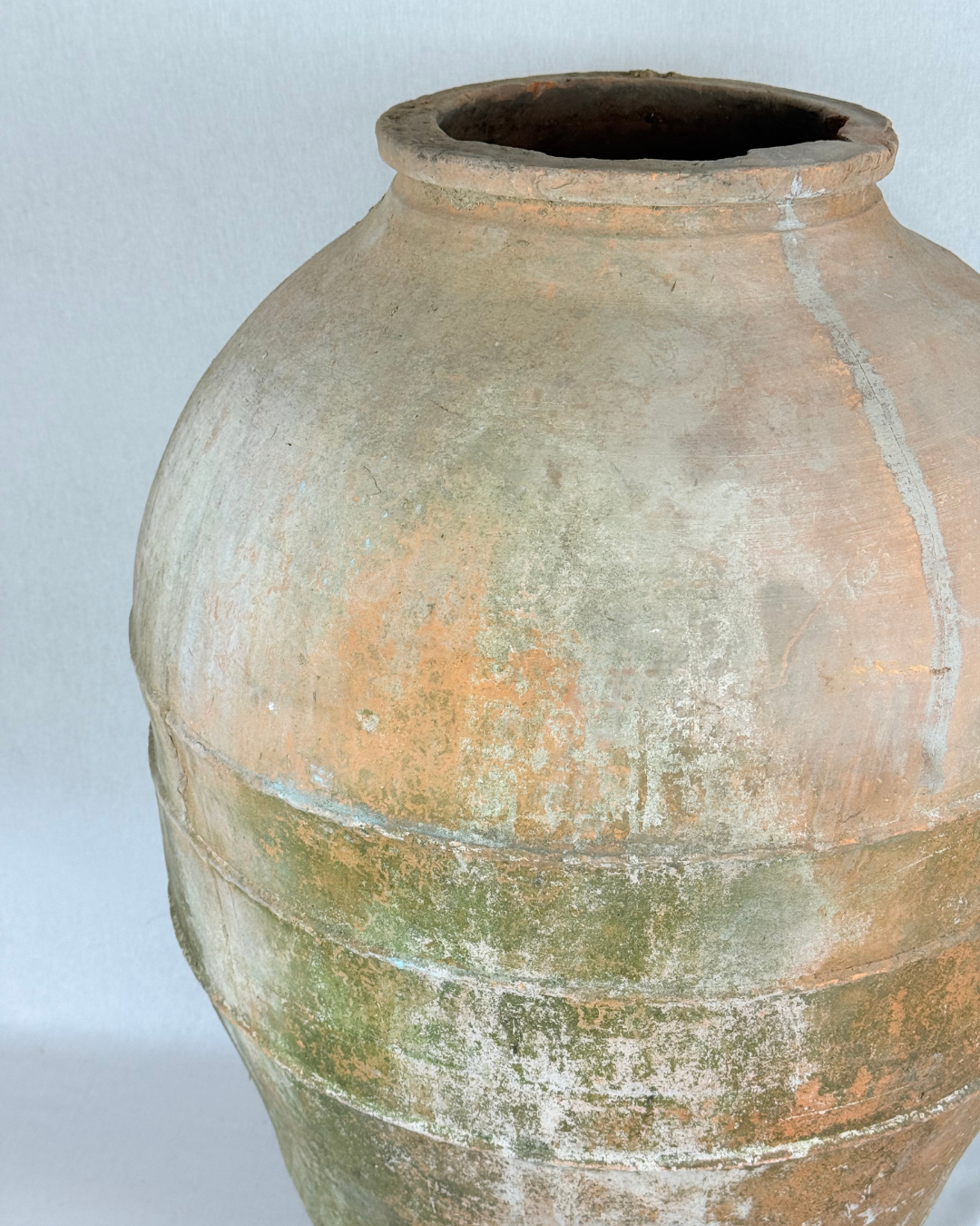 This rustic pot from Anatolia, Turkey, exudes history and charm. Originally used to store olive oil, honey, water, or wine, it is made from terracotta clay and has developed a rich, aged patina over time. Some pieces can have subtle oil stains, adding to their unique character. Hand-thrown and one-of-a-kind, each pot makes a striking decorative statement for the home or garden.