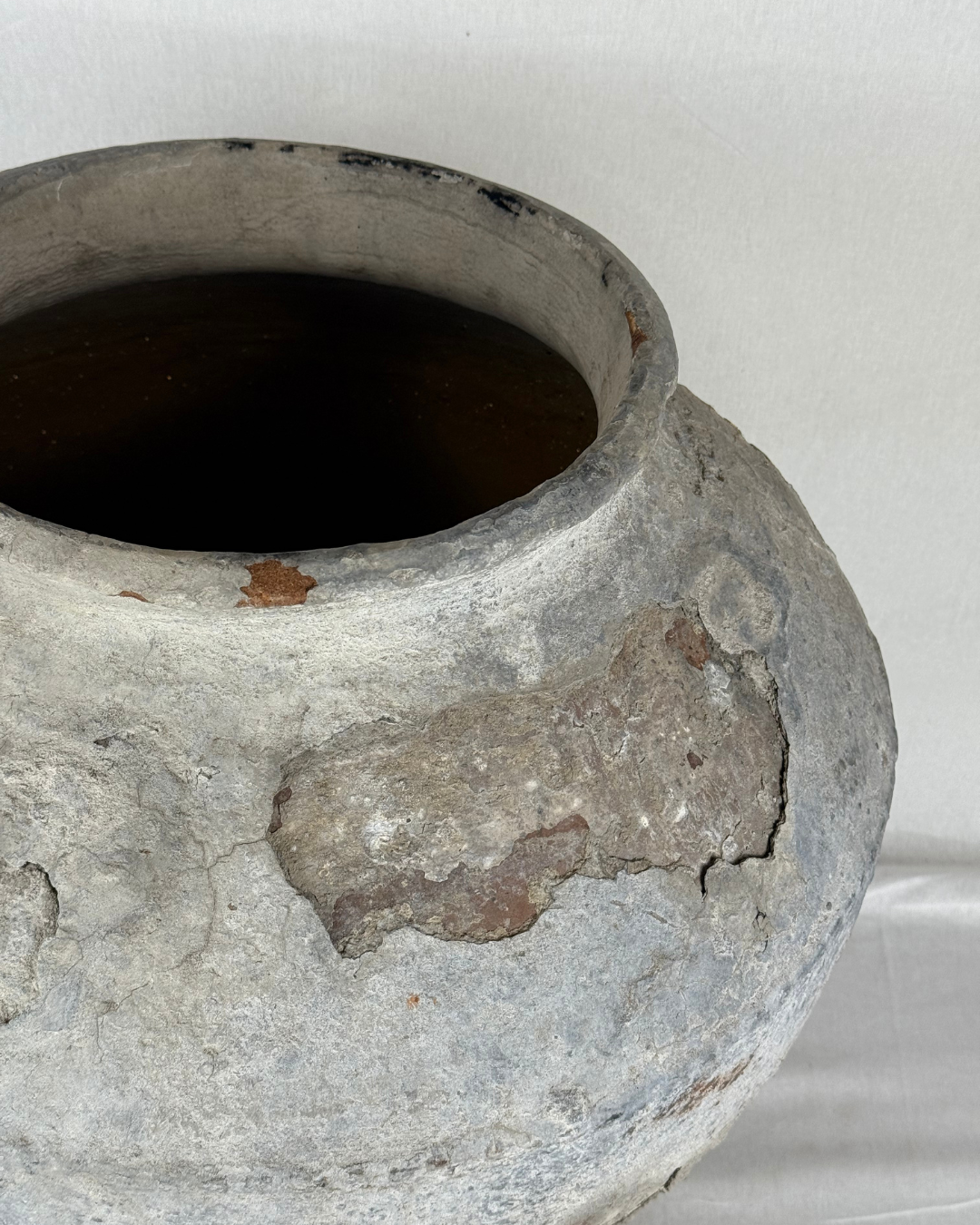 Authentic earthenware pot from Indonesia, once used to store water. Over time, layers of cement were hand-applied, giving each piece its unique, weathered texture.