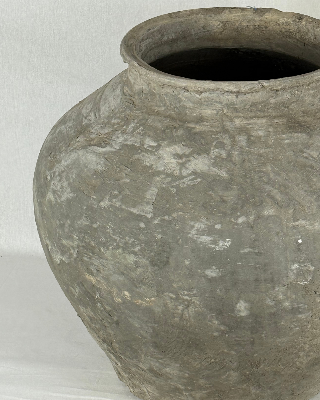 Authentic earthenware pot from Indonesia, once used to store water. Over time, layers of cement were hand-applied, giving each piece its unique, weathered texture.