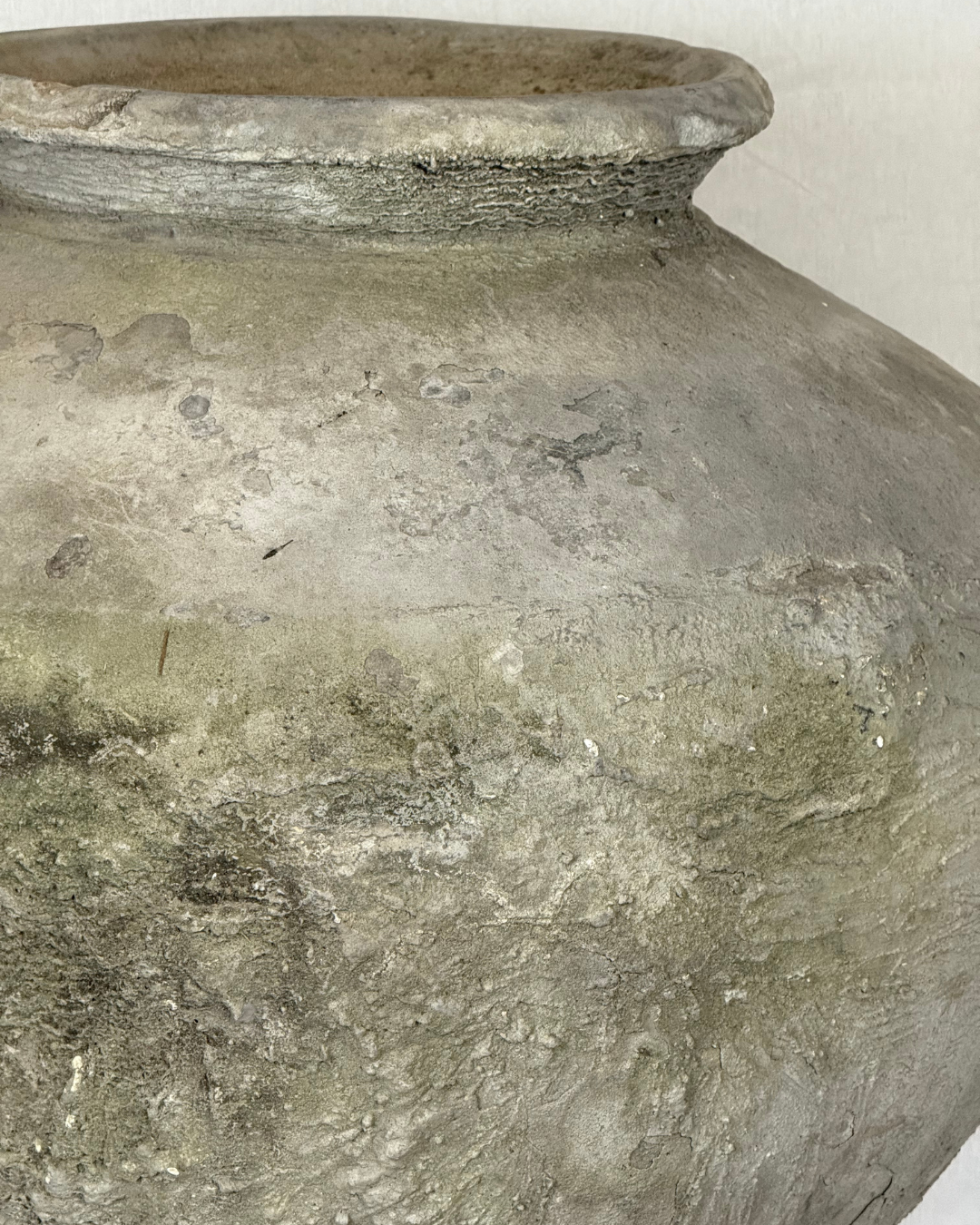Authentic earthenware pot from Indonesia, once used to store water. Over time, layers of cement were hand-applied, giving each piece its unique, weathered texture.