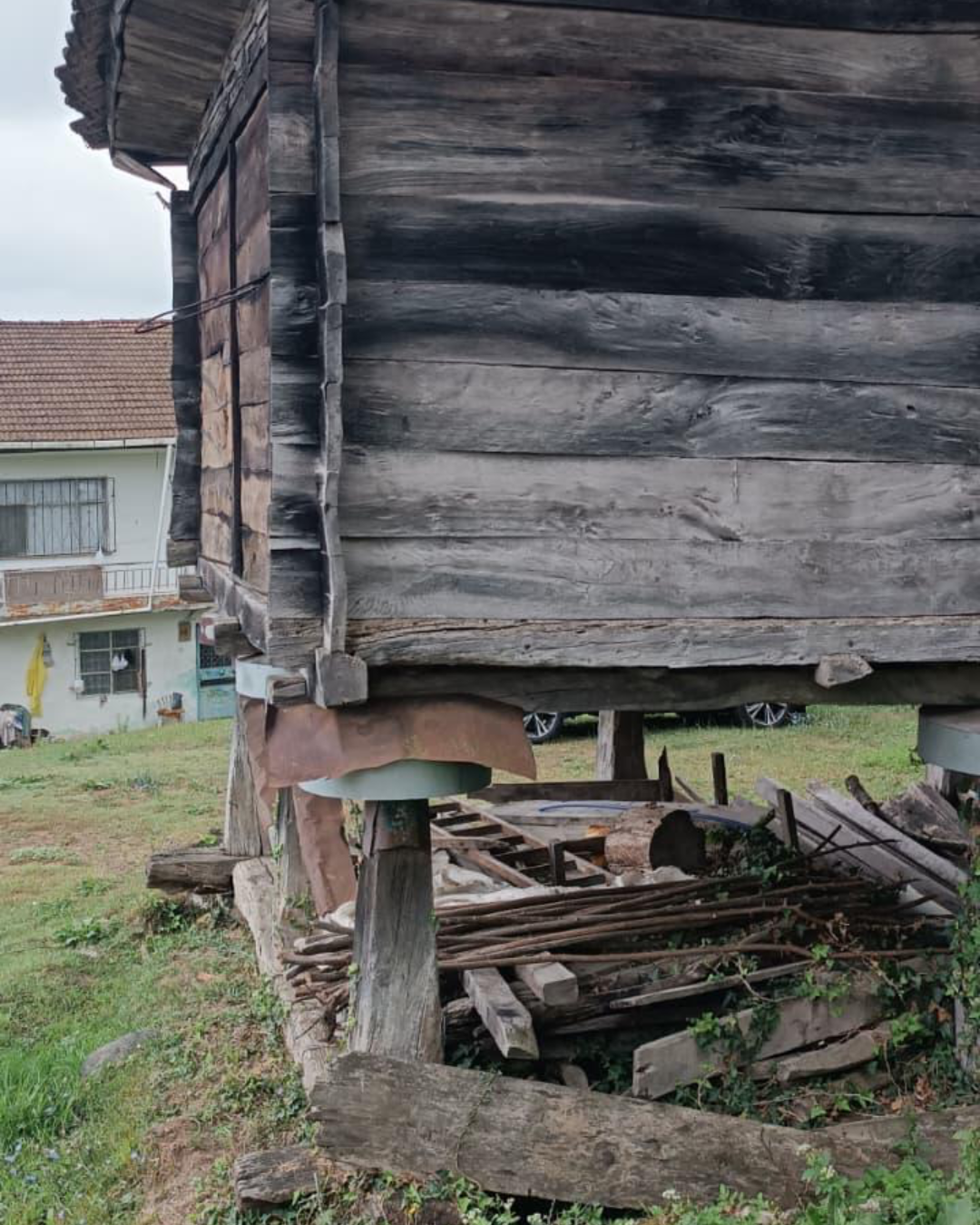 The base is crafted from reclaimed wood, salvaged from the foundation posts of an old farmhouse (see the last photo). The wood carries its own story, with a beautiful natural texture that adds depth and authenticity.